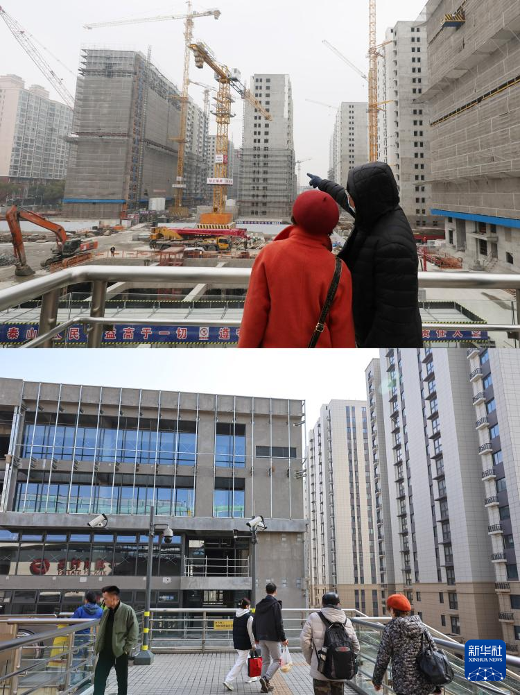 拼版照片:上图为2024年1月10日拍摄的两名市民在彭浦新村地铁站出站天桥上观看彭一小区非成套旧住房改造工程建设工地;下图为2025年2月28日在彭浦新村地铁站出站天桥上拍摄的建成后的彭一小区非成套旧住房改造项目。