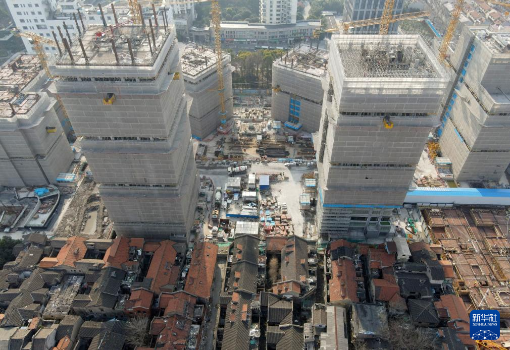 这是2025年2月28日拍摄的上海市黄浦区508-514街坊地块上海壹号院项目施工现场(无人机全景照片)。