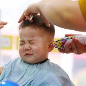3月1日,小朋友在山东省枣庄市一家婴幼儿专业理发店理发。