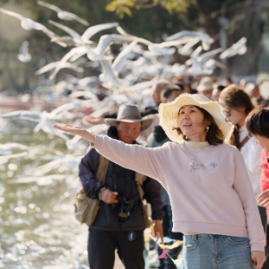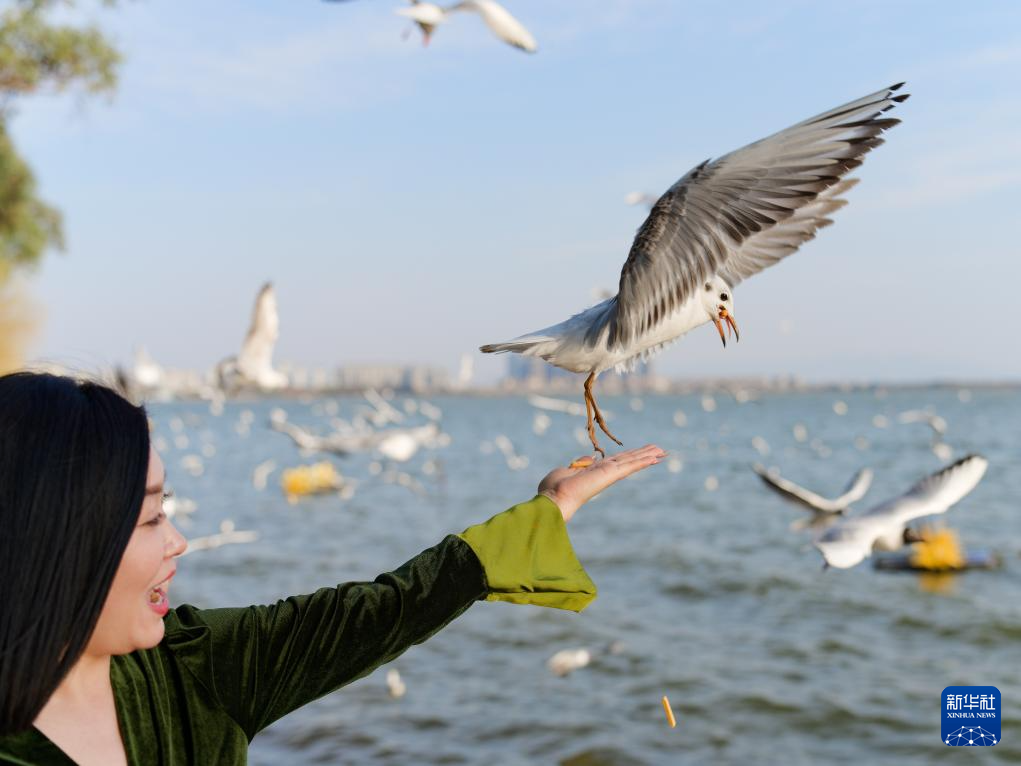 2月28日,游人在昆明市海埂公园与红嘴鸥互动。