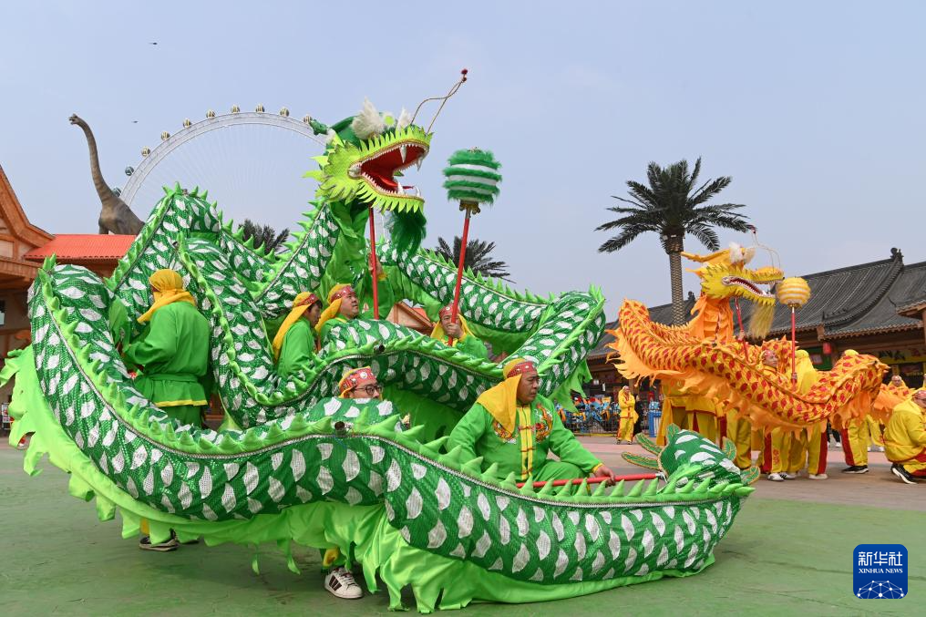 3月1日,在河南省沁阳市怀府恐龙园,一支民间舞龙队进行舞龙表演。