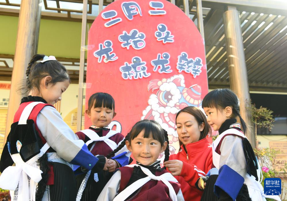 2月28日,在云南省丽江市新苗幼儿园“二月二,龙抬头”主题活动中,老师为孩子们“梳龙头”“扎龙辫”。