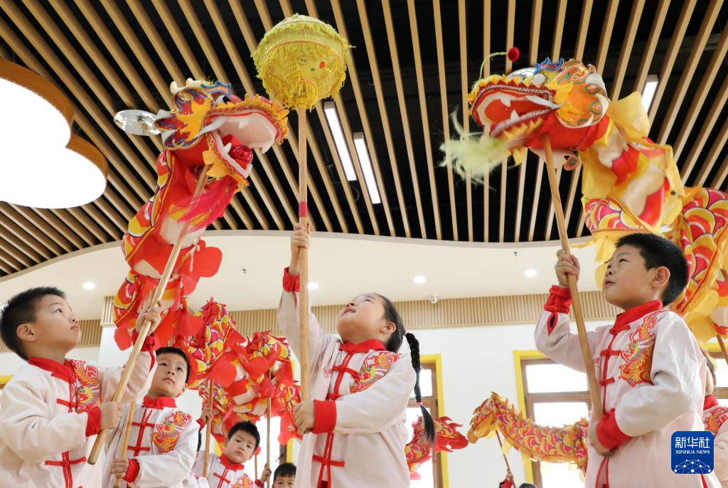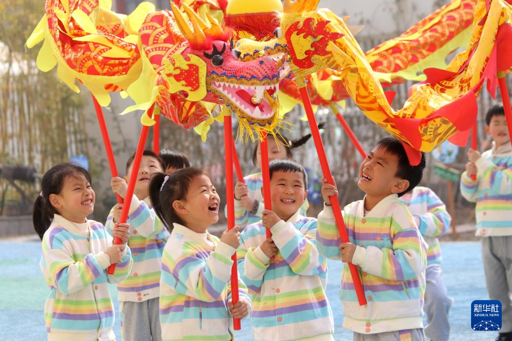2月28日,在山东省滨州市博兴县一幼儿园,小朋友体验传统舞龙。