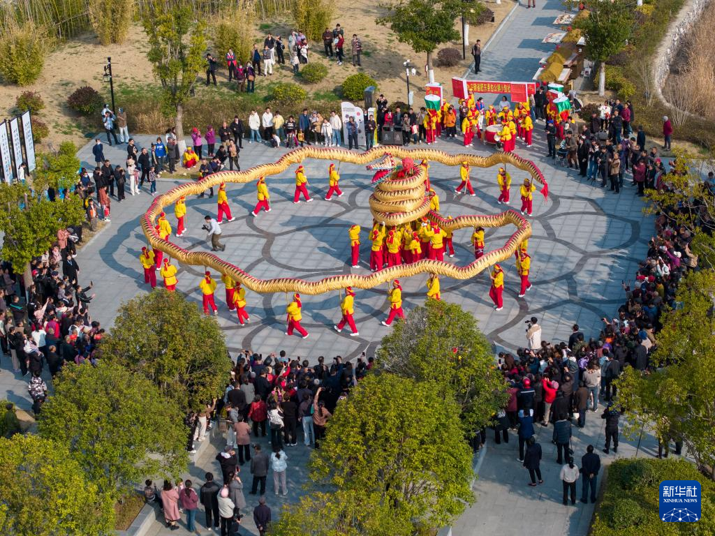 3月1日,在安徽省合肥市肥东县包公镇,当地居民开展“肥东洋蛇灯”民俗活动(无人机照片)。