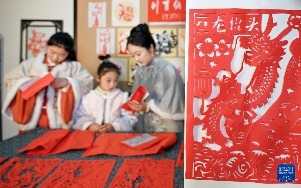 3月1日,在安徽省宿州市砀山县砀城镇土山社区,剪纸技艺传承人和小朋友一起剪春龙。