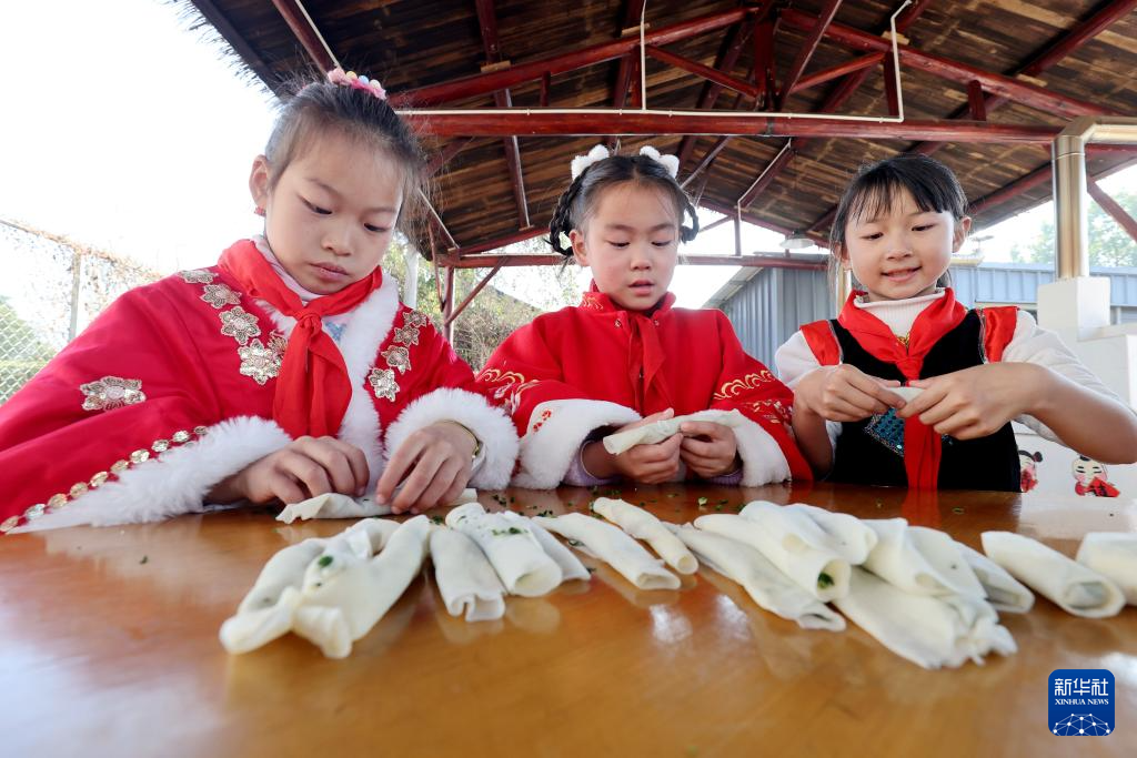 2月28日,浙江省湖州市德清县干山小学的学生在制作春卷。