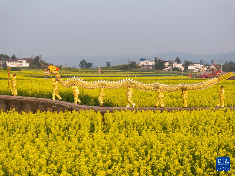 2月28日,在四川省泸州市泸县全国重点文物保护单位龙脑桥景区,一支雨坛彩龙队在泸县现代农业产业园谭坝核心区油菜花田里表演。雨坛彩龙被列入第一批国家级非物质文化遗产名录。