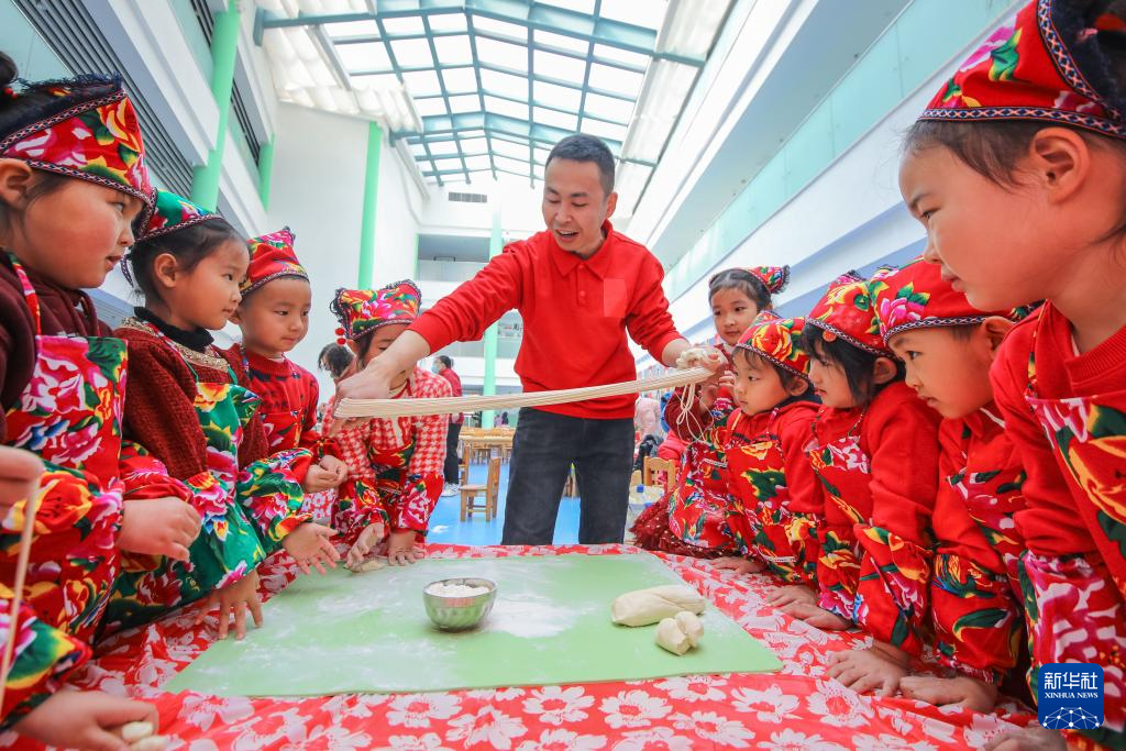 2月28日,在山东省青岛市李沧区衡水路幼儿园开展的“二月二,龙抬头”民俗活动中,面点师为孩子们展示制作龙须面。