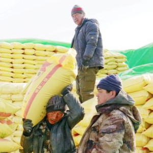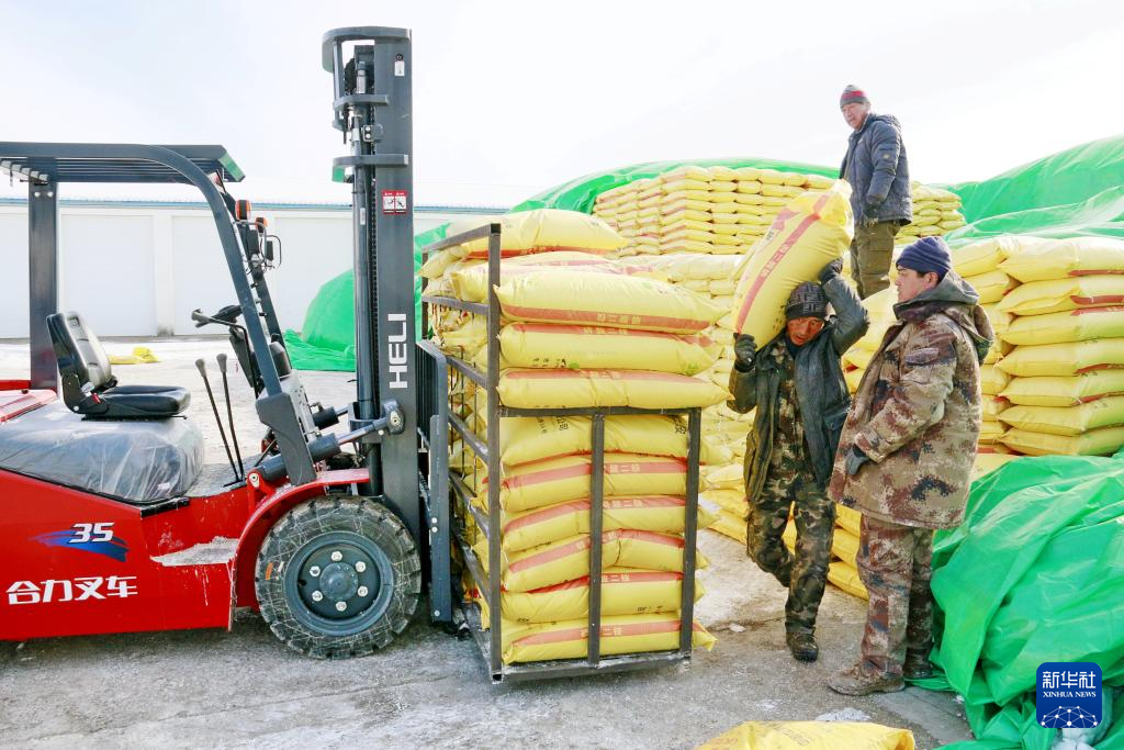 3月1日,黑龙江北大荒集团五大连池农场有限公司工人在转运肥料。