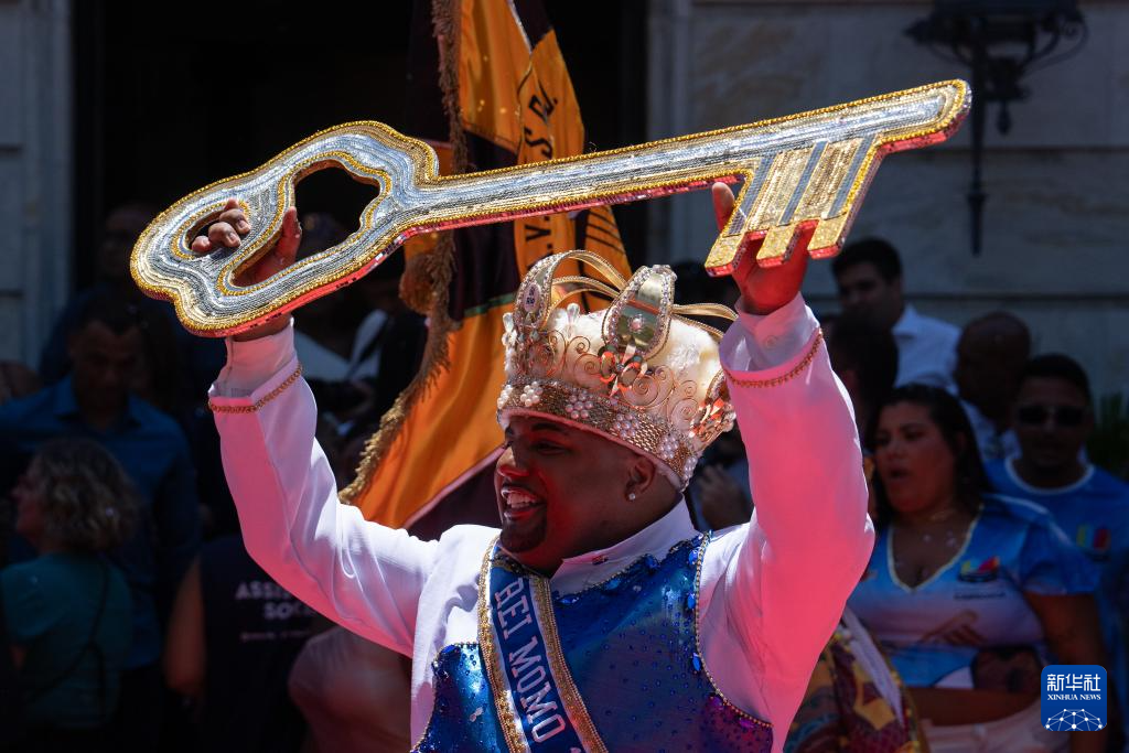 2月28日,“狂欢节国王”在巴西里约热内卢市长宫展示金钥匙。