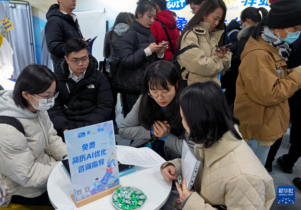 2月14日,在2025年上海市春季促进就业综合性大型招聘会现场,工作室团队在为求职者进行简历优化指导。