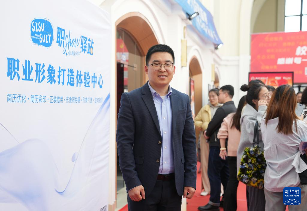2月28日,在上外学生宿舍区的服务点,一名学生在借用正装,准备参加校园招聘会。