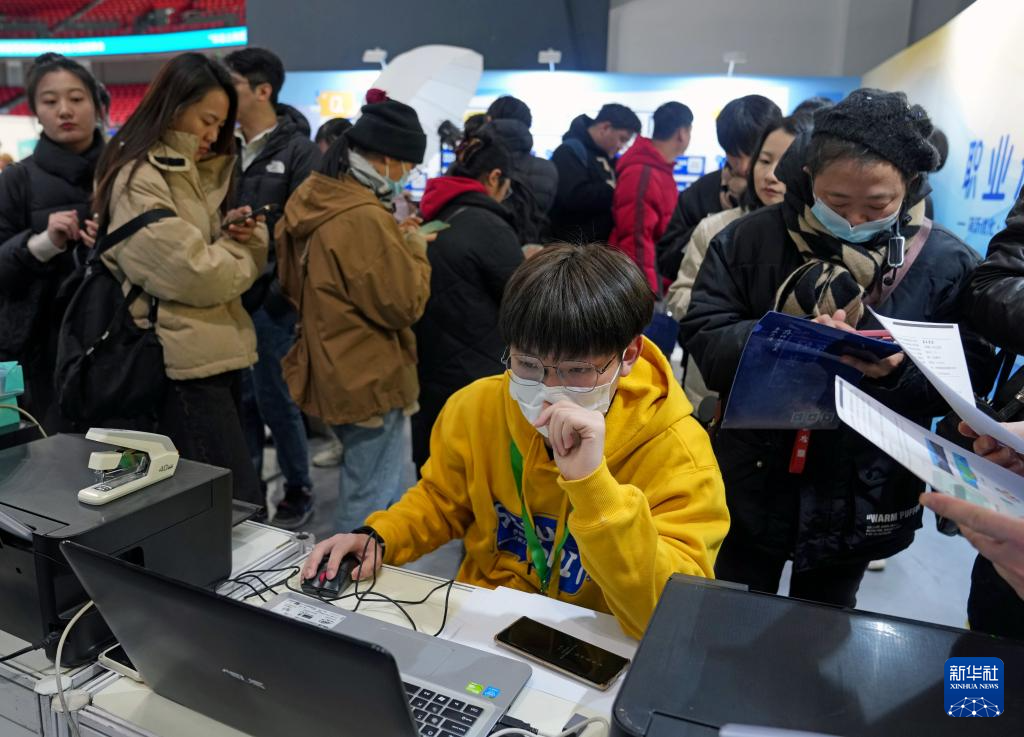 2月14日,在2025年上海市春季促进就业综合性大型招聘会现场,工作室团队在为求职者免费打印简历。