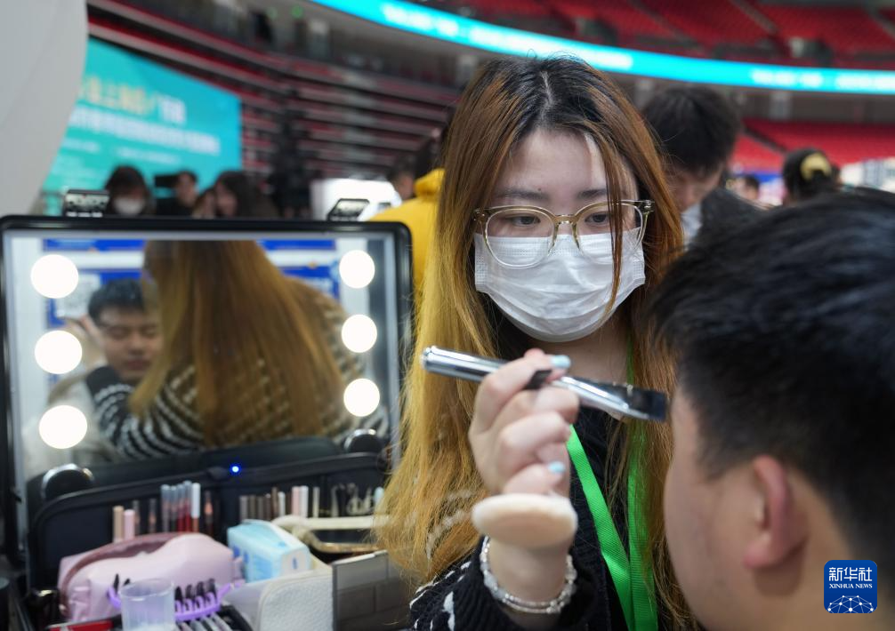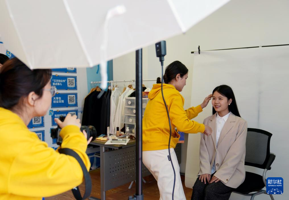 2月28日,在2025年上海市春季促进就业综合性大型招聘会现场,工作室团队在为求职者化淡妆,准备拍摄形象照。