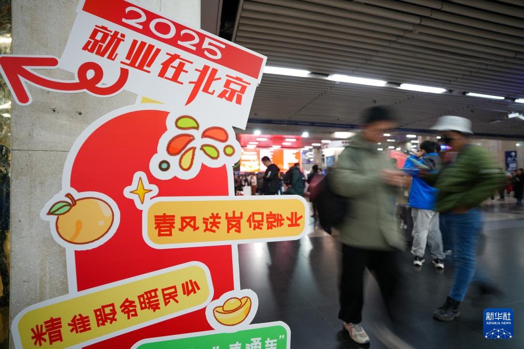 2月28日,旅客和求职者经过“来京就业直通车”专场招聘会指示牌。