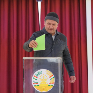 3月2日,塔吉克斯坦议会上院议长兼杜尚别市长鲁斯塔姆在杜尚别参加议会下院选举投票。