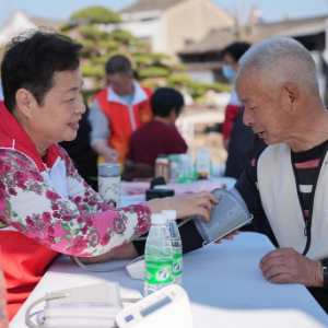 3月2日,志愿者在宁波市奉化区萧王庙街道青云村为村民测量血压。
