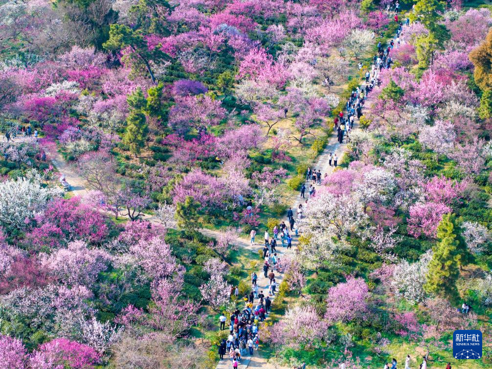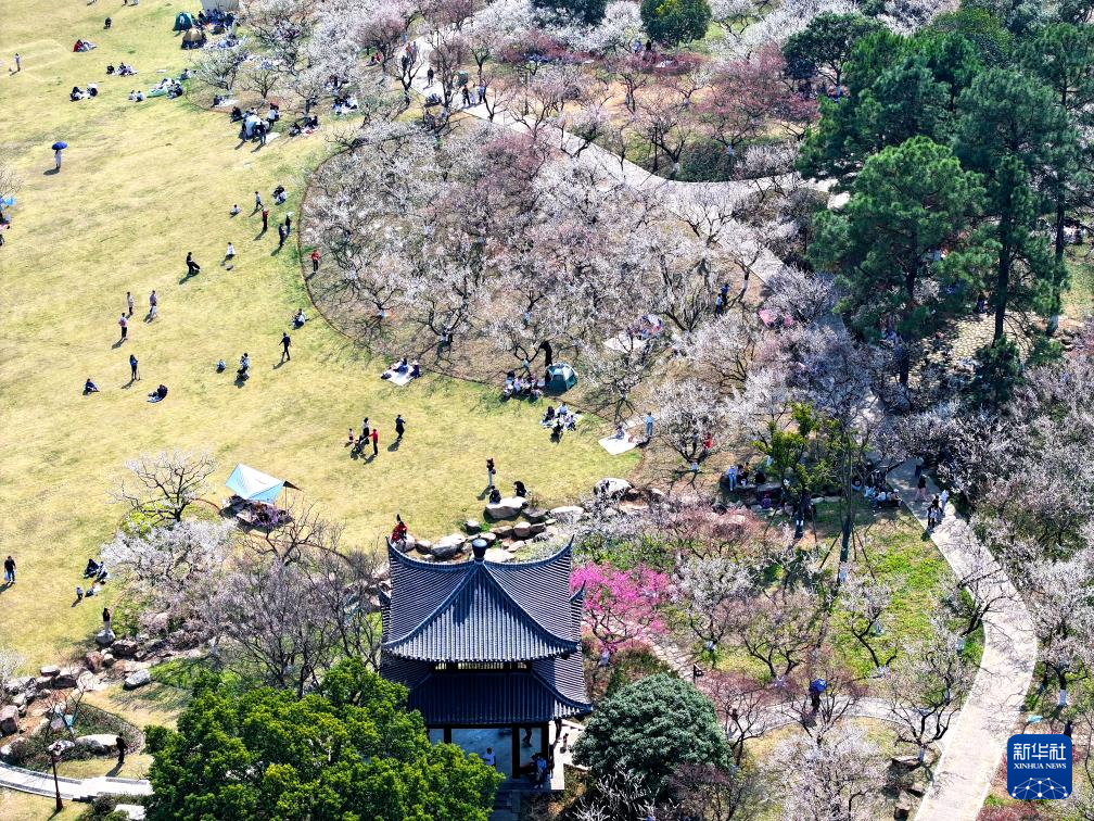 3月1日,众多游客在南京梅花山景区赏花踏青(无人机照片)。