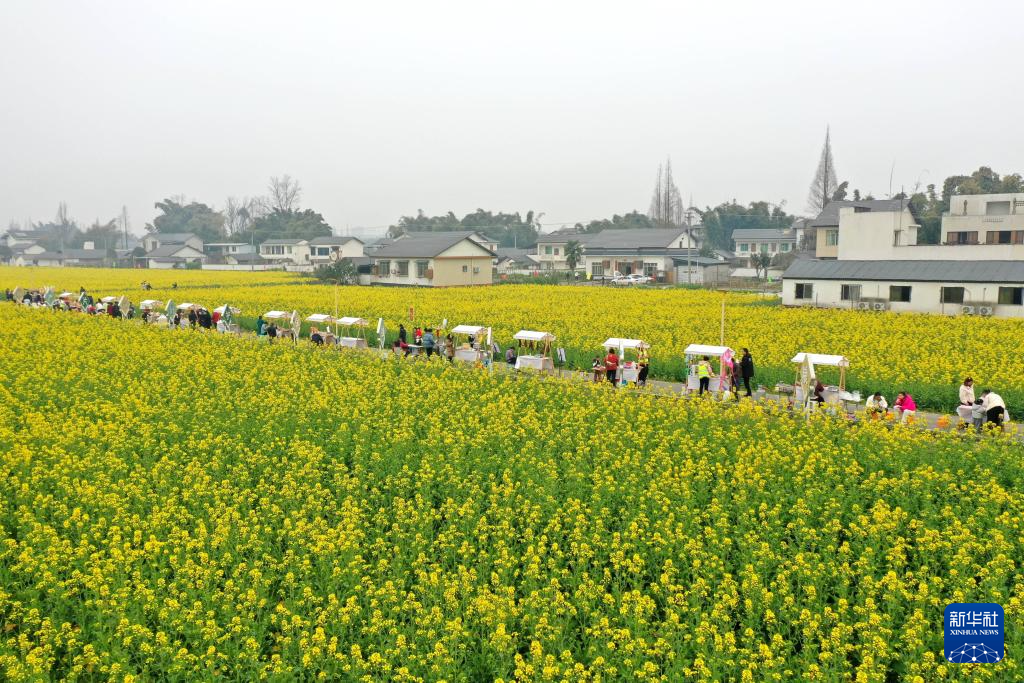 3月1日,游客在四川省眉山市青神县青竹街道新光村花海“集市”购物(无人机照片)。