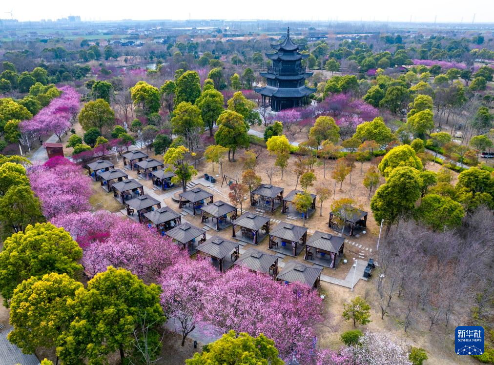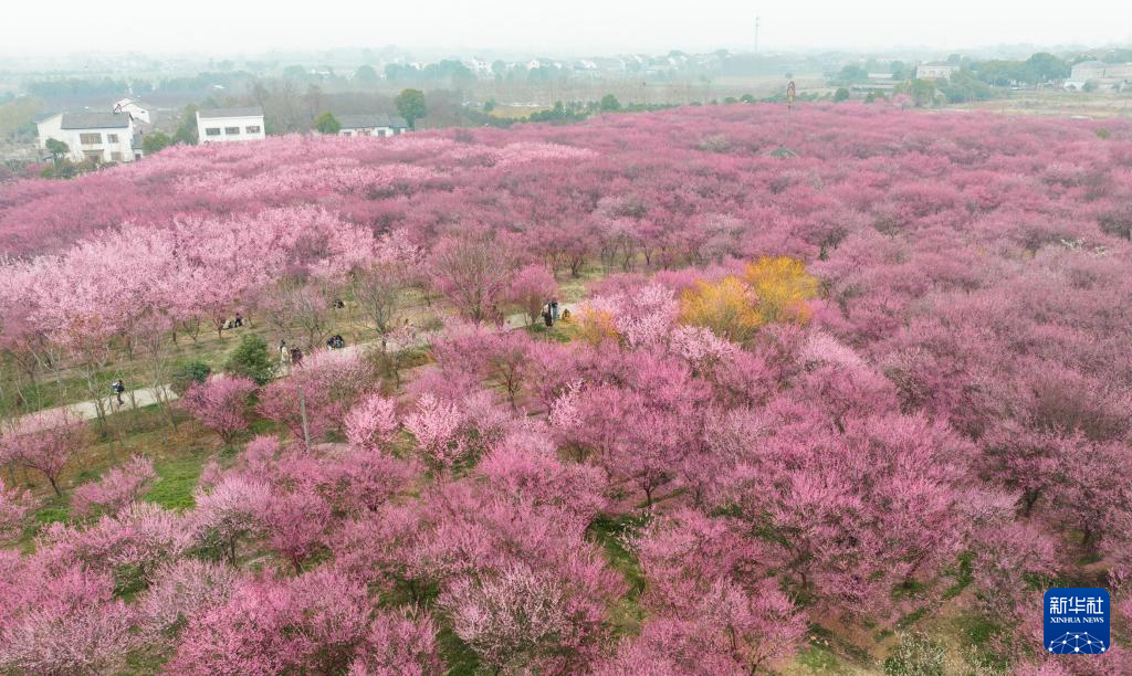 3月2日,游客在江苏省盐城市大丰区梅花湾景区踏青赏花(无人机照片)。