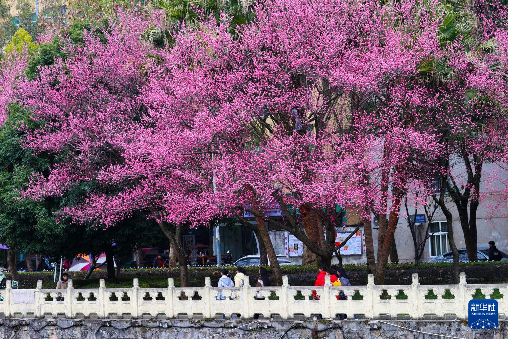 3月1日,游客在重庆市黔江区河滨公园观赏梅花。