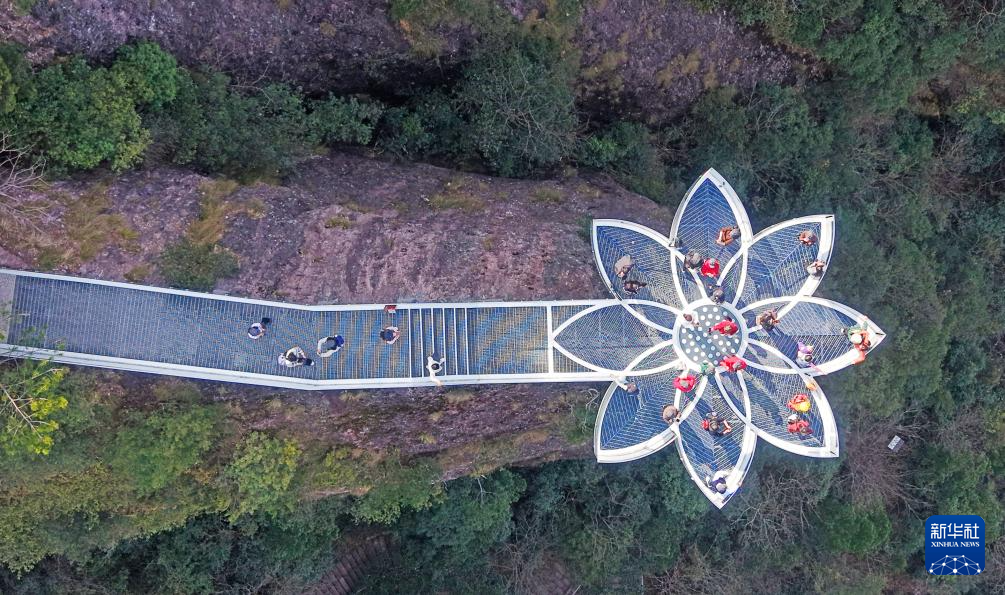 3月1日,游客在浙江省台州市仙居县神仙居景区莲花台上游玩(无人机照片)。