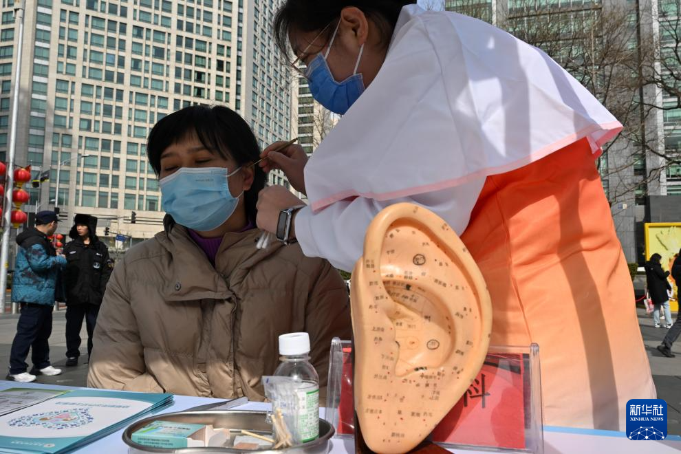 3月3日,北京市回民医院志愿者为市民进行耳穴贴治疗。