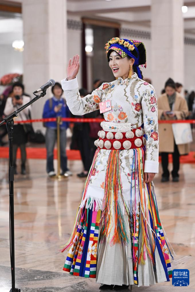 3月5日,第十四届全国人民代表大会第三次会议首场“代表通道”集中采访活动在北京人民大会堂举行。这是全国人大代表格西王姆接受媒体采访。