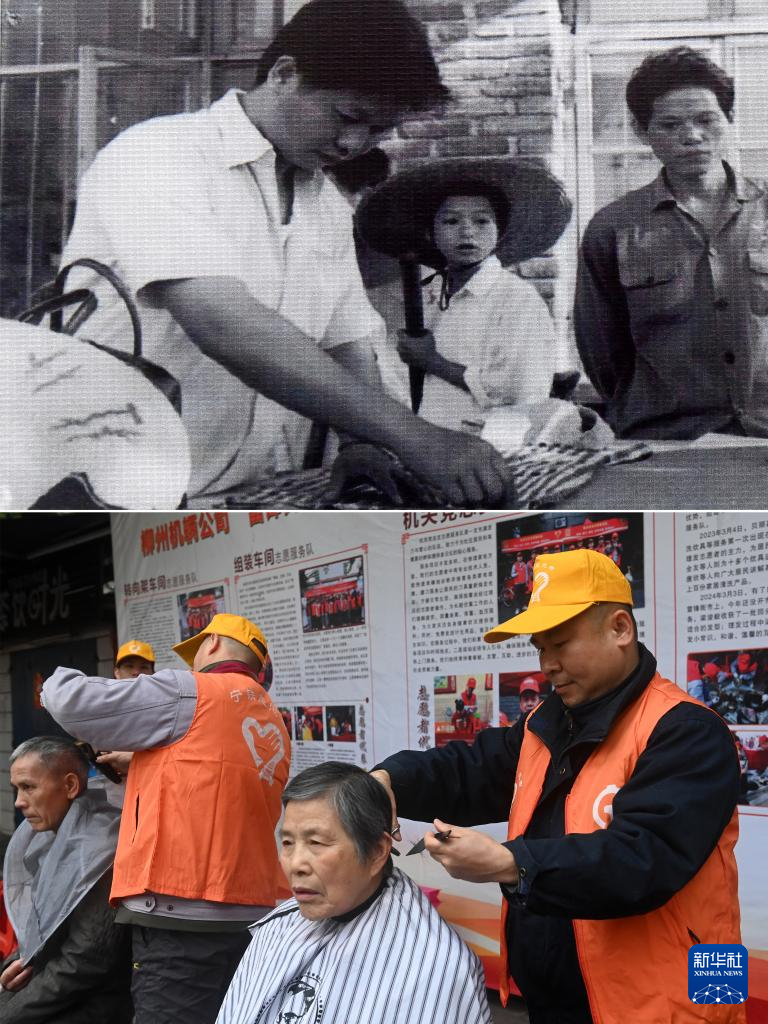 拼版照片:上图:20世纪70年代,“雷锋街市”志愿者为市民裁剪衣服(柳州机车车辆有限公司供图)。下图:2025年3月5日,在广西柳州市革新路“雷锋街市”,志愿者在为市民理发(新华社记者 陆波岸 摄)。