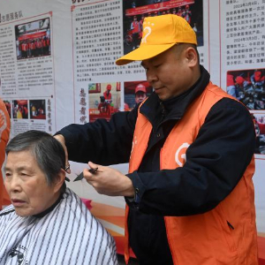 3月5日,在广西柳州市革新路“雷锋街市”,志愿者在为市民理发。
