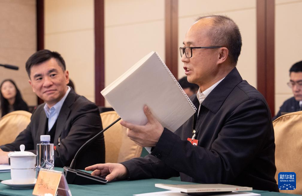 3月5日,在全国政协十四届三次会议社会福利和社会保障界别小组会议现场,李庆忠委员展示他手中的盲文版政府工作报告。
