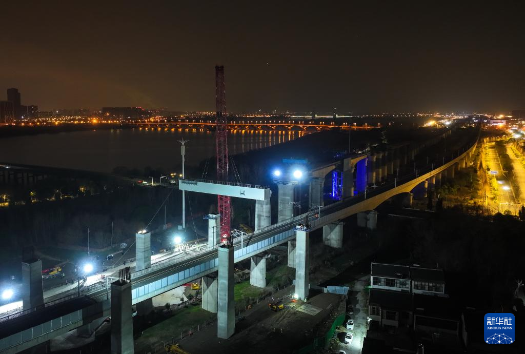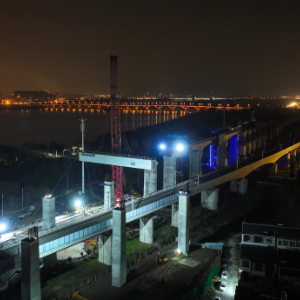 3月6日凌晨,在中国铁建大桥局新建上海至南京至合肥高铁通泰扬特大桥上跨连镇高铁施工现场,长35.28米、重达208吨钢横梁被精准吊装嵌入桥墩支点,标志着沪宁合高铁跨连镇高铁首跨钢横梁吊装到位,为后续架梁和无砟轨道施工奠定了坚实的基础。