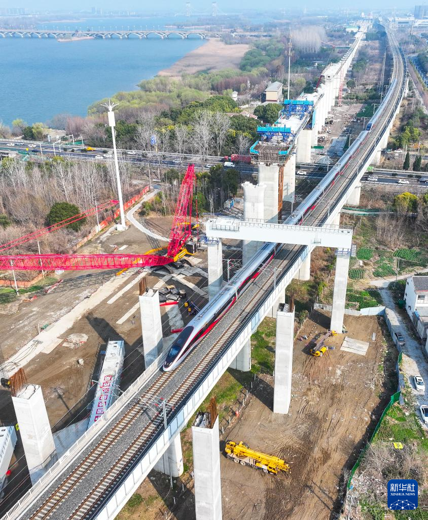 一列动车组列车从沪宁合高铁跨连镇高铁首跨钢横梁下通过(3月6日摄,无人机照片)。