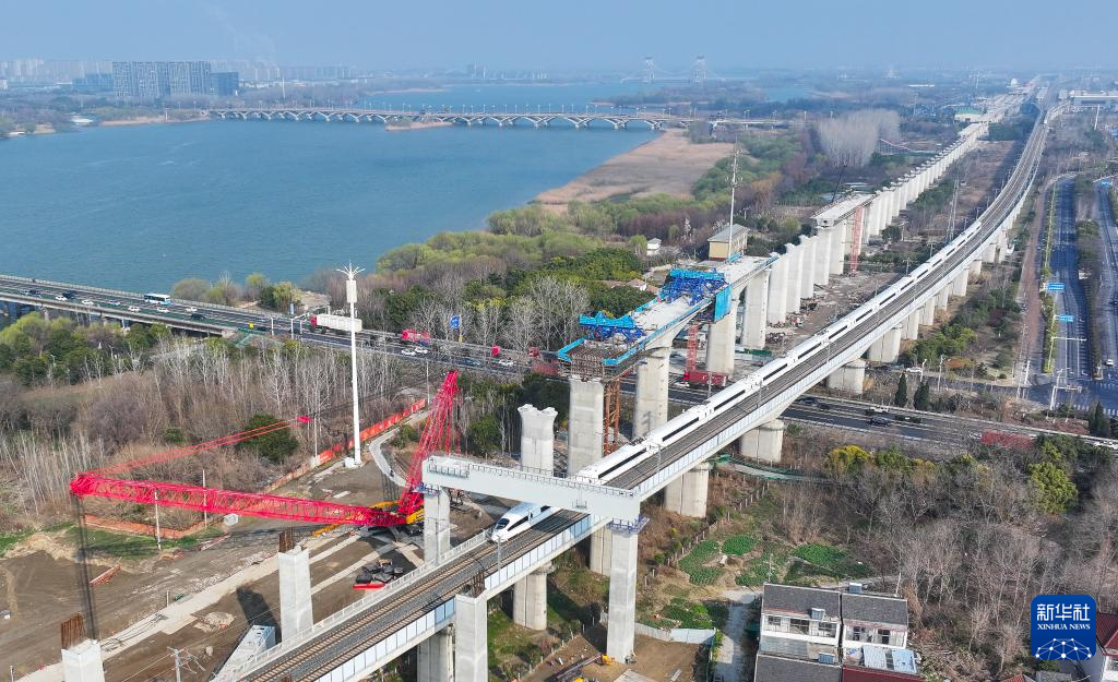 沪宁合高铁跨连镇高铁首跨钢横梁吊装作业现场(3月6日摄,无人机照片)。