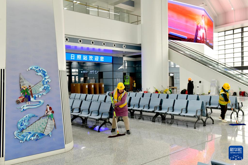 3月7日,工作人员在日照火车站候车大厅进行保洁工作。