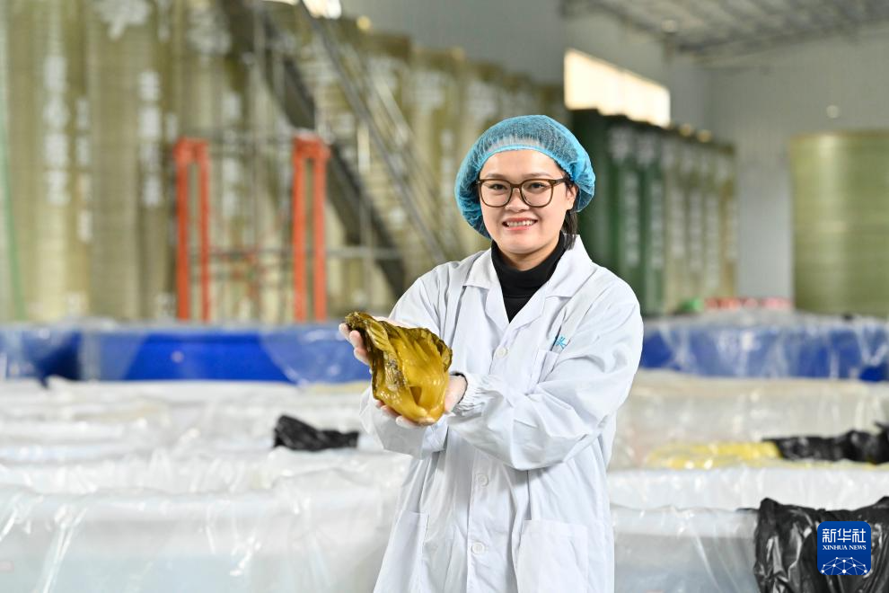 在广西柳州市柳江区成团镇六道村,颜茜茜在公司生产车间里展示腌制的酸菜(2025年3月6日摄)。30岁的颜茜茜是当地一名返乡创业青年。2021年,大学毕业后在机场工作了五年的颜茜茜,辞职回到家乡创业,和父亲颜建条成立了农业公司,采用“公司+种植基地+合作社+农户+加工厂”的经营模式,发展竹笋和蔬菜的种植、研发、腌制产业,探索传统腌菜产业规模化、高品质生产新模式。