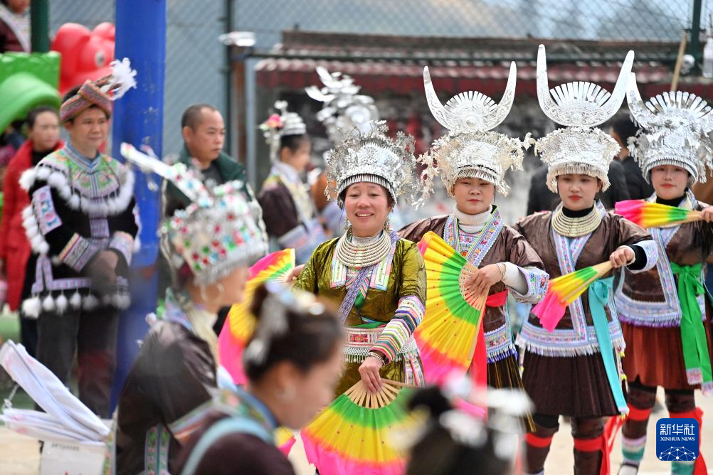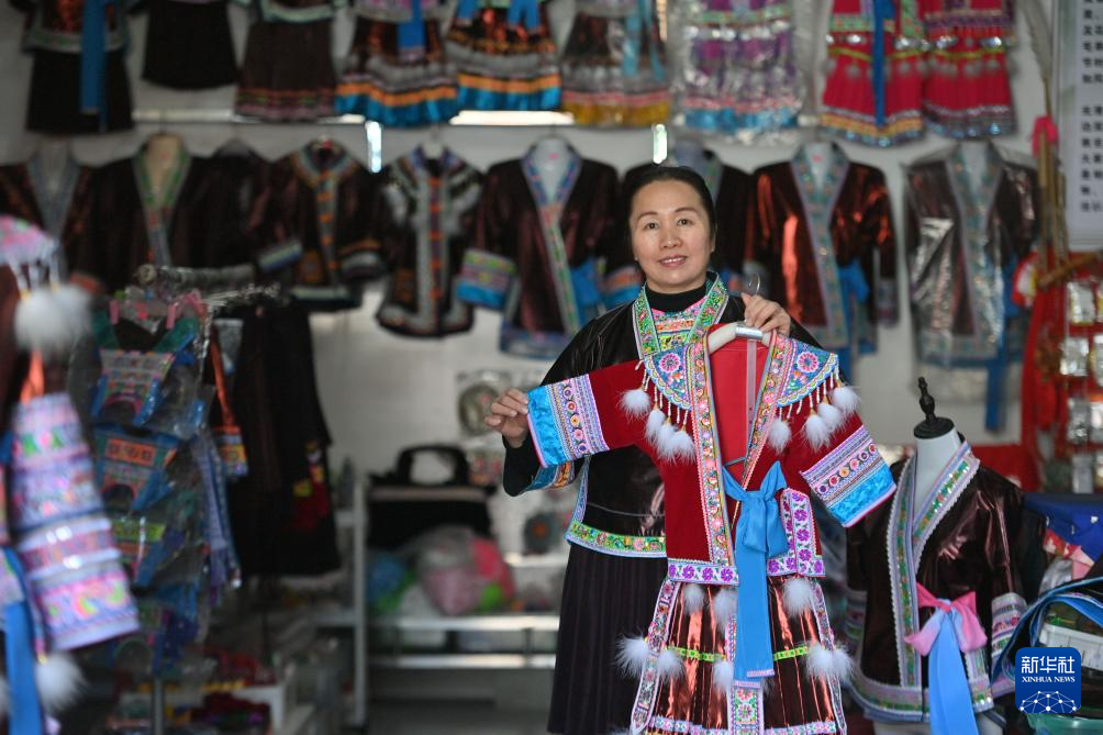 在广西柳州市融水苗族自治县杆洞乡杆洞村,杨洪英在展示苗衣(2025年2月27日摄)。51岁的苗族妇女杨洪英是苗族服饰制作技艺自治区级非遗传承人、柳州市民间艺人。自20世纪90年代起,杨洪英开始以制作苗衣和传承刺绣文化为业,并逐渐成为大苗山里的致富女能手,带动苗族妇女居家就业。
