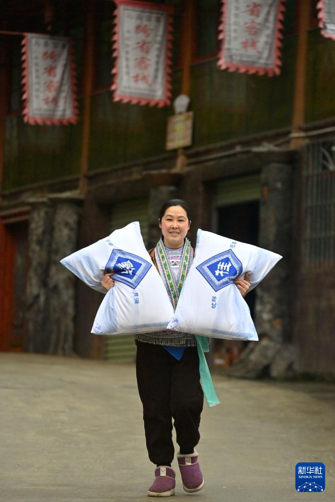 在广西柳州市融水苗族自治县杆洞乡党鸠村乌英苗寨,40岁的何玉青在展示民宿的床上用品(2025年2月26日摄)。18年前,何玉青和丈夫返乡创业,他们买车拉客运货、经营小商店、种田养鱼、办民宿卖特产,逐渐成为苗寨的致富带头人。