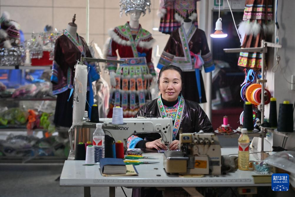 在广西柳州市融水苗族自治县杆洞乡杆洞村,杨洪英在制作苗衣(2025年2月27日摄)。51岁的苗族妇女杨洪英是苗族服饰制作技艺自治区级非遗传承人、柳州市民间艺人。自20世纪90年代起,杨洪英开始以制作苗衣和传承刺绣文化为业,并逐渐成为大苗山里的致富女能手,带动苗族妇女居家就业。