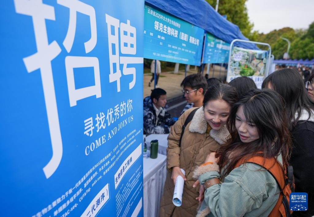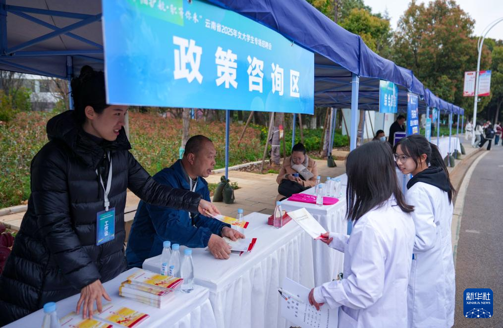 3月7日,求职者在云南省2025年女大学生专场招聘会招聘展位前查看招聘信息。
