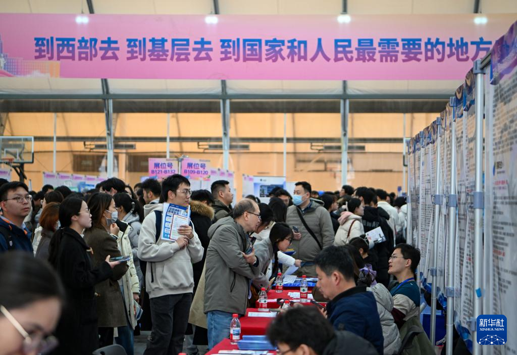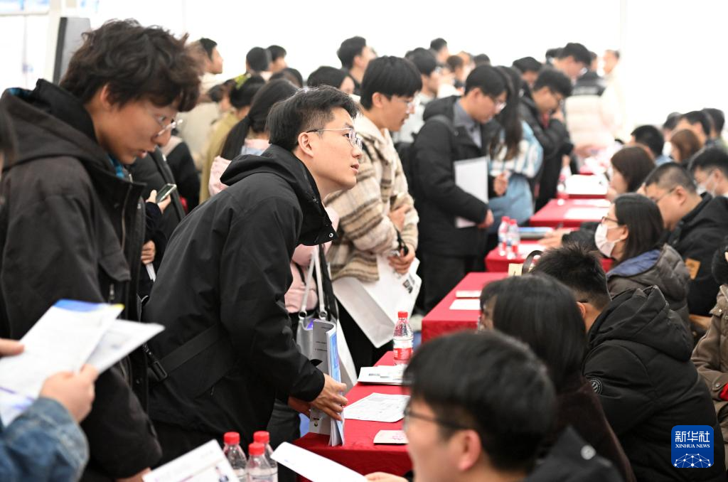 3月7日,在天津南开大学2025届毕业生春季校园双选会上,求职学生在招聘企业展位前查看岗位需求。