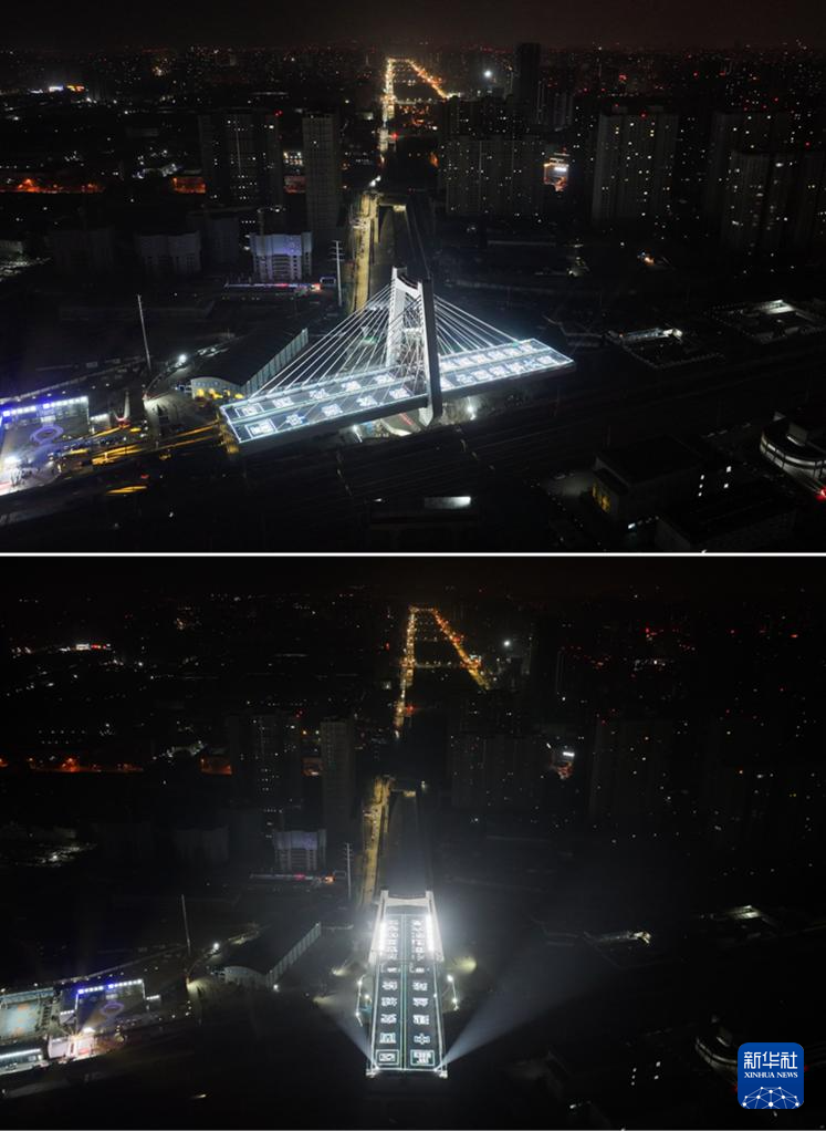 这是一张拼版照片,上图为:转体施工前的西安幸福路北延伸工程独塔斜拉桥(3月8日摄,无人机照片);下图为:完成转体施工的西安幸福路北延伸工程独塔斜拉桥(3月8日摄,无人机照片)。