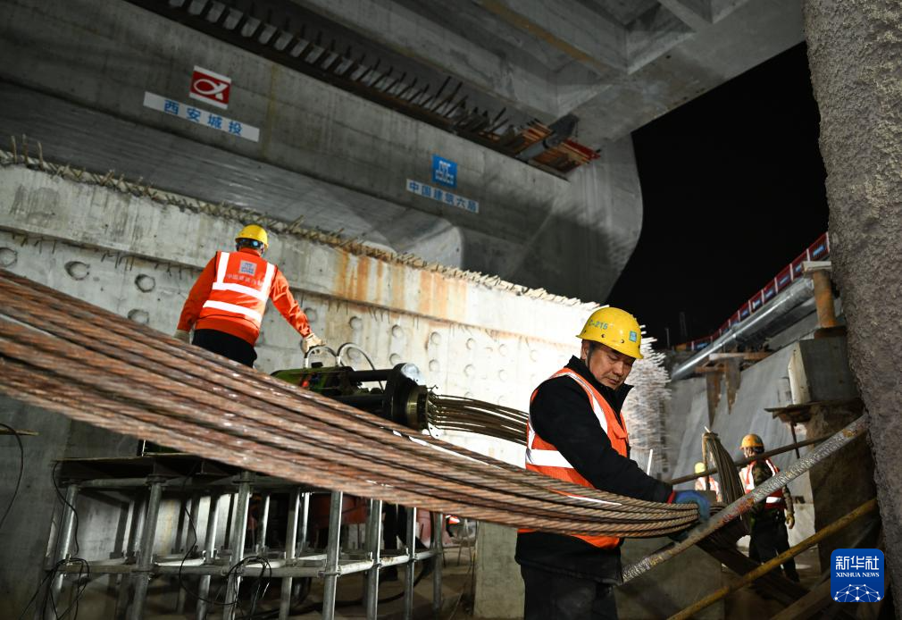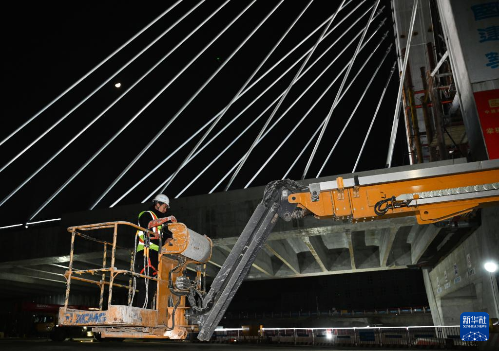 3月8日,工人在西安幸福路北延伸工程独塔斜拉桥转体施工现场工作。