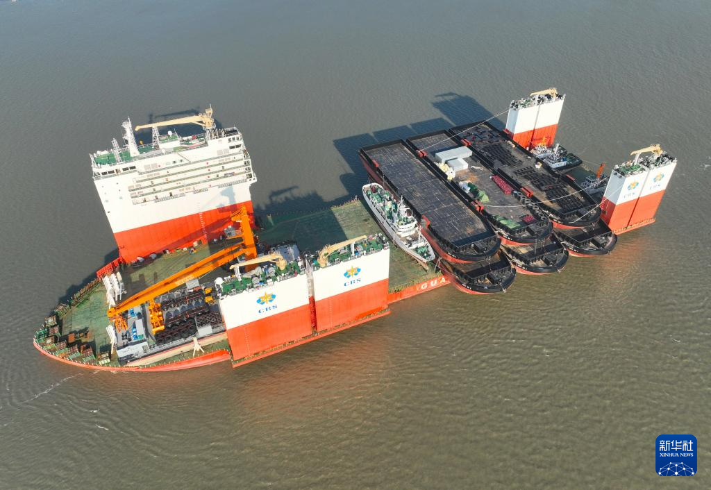 3月3日,全球第三大半潜船“华瑞龙”在福建宁德灶屿水域装载13艘船舶启航前往非洲几内亚。