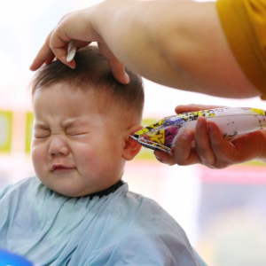 3月1日,在山东省滕州市一家儿童理发屋,一名小朋友在理发。