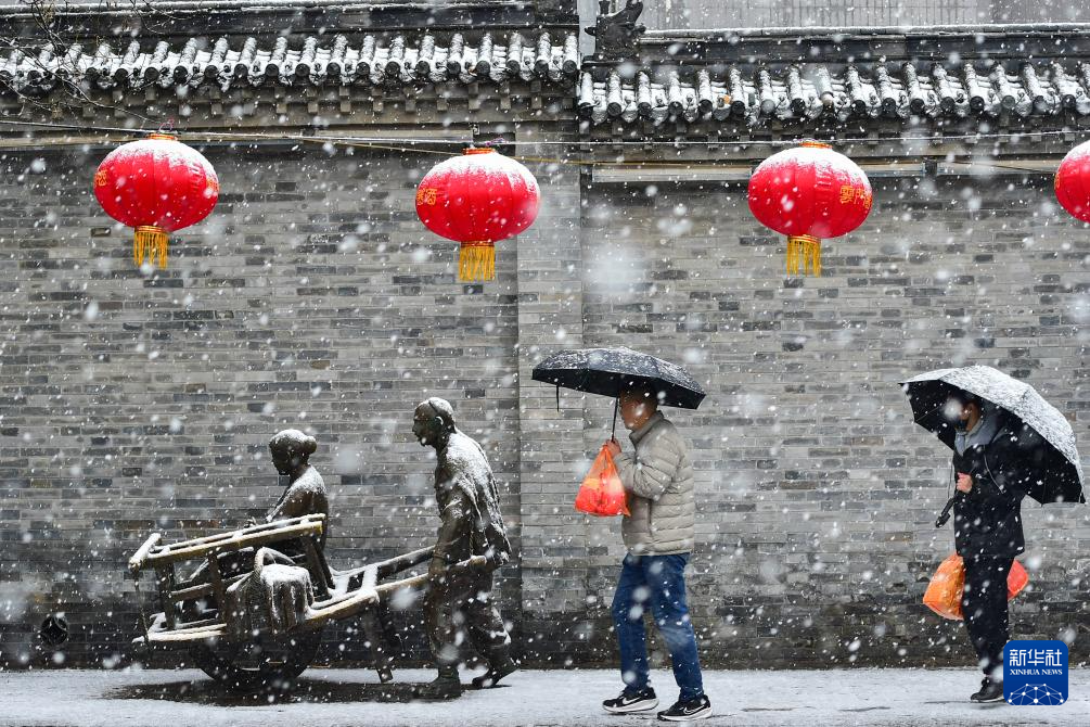 3月2日,游客冒雪在山东省青州古城景区游玩。