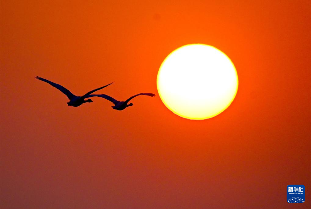 3月6日,山东荣成成山镇天鹅湖畔,大天鹅在朝阳下飞舞。