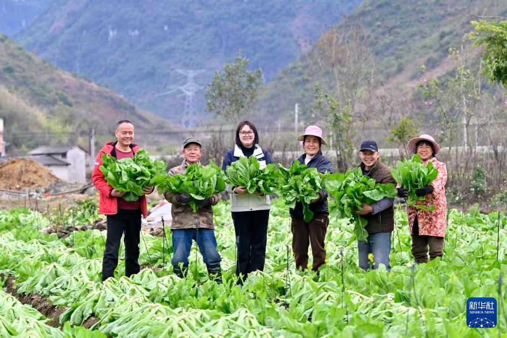 在广西柳州市柳江区三都镇白见村板朝屯,颜茜茜(左三)、父亲颜建条(左一)和村民们在展示刚刚采摘的芥菜(2025年3月6日摄)。