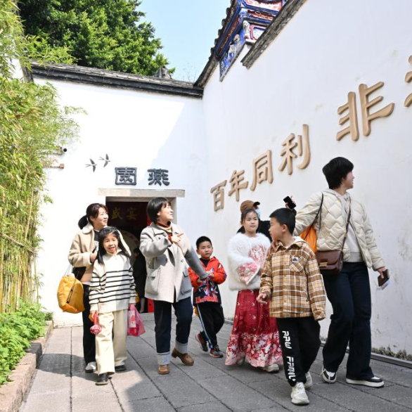 3月8日,家长带领小朋友游览福州三坊七巷同利肉燕非遗文化体验馆。