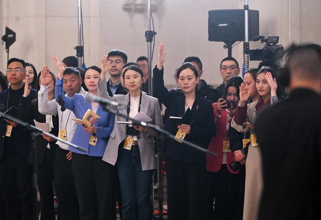3月10日,全国政协十四届三次会议第三场“委员通道”集体采访活动在北京人民大会堂举行。这是记者举手提问。
